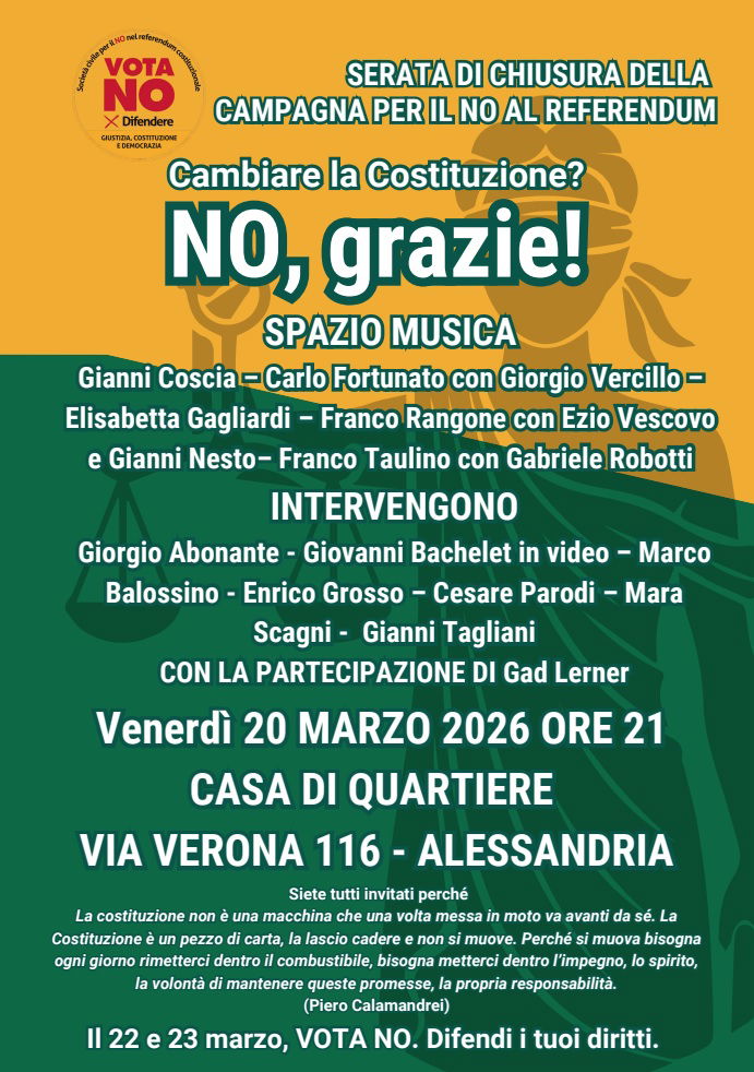 ALESSANDRIA – Venerdì 20 marzo alle 21 alla Casa di Quartiere di Alessandria di via Verona 116 si terrà la serata di chiusura della campagna per il No al referendum costituzionale in vista del voto del 22 e 23 marzo. Durante la serata è previsto anche uno spazio musicale con Gianni Coscia, Carlo Fortunato e Giorgio Vercillo, Elisabetta Gagliardi, Franco Rangone con Ezio Vescovo e Gianni Nesto, e Franco Taulino con Gabriele Robotti.