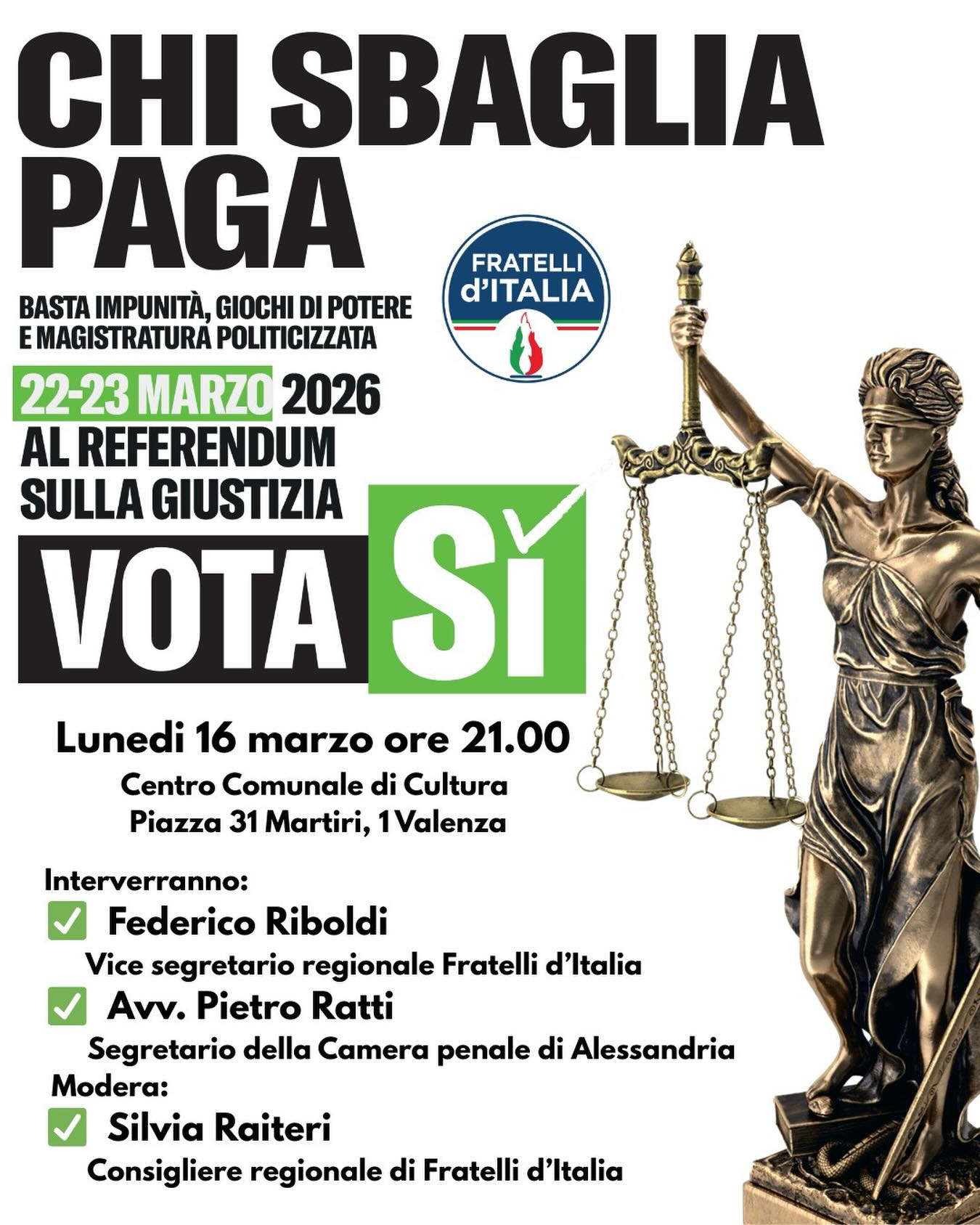 VALENZA – Un incontro pubblico sul referendum sulla giustizia del 22 e 23 marzo 2026 è in programma questo lunedì 16 marzo alle 21 al Centro Comunale di Cultura di Piazza 31 Martiri 1 a Valenza. L’iniziativa è promossa da Fratelli d’Italia e punta ad approfondire i temi al Sì. All’appuntamento interverranno Federico Riboldi, vice segretario regionale di Fratelli d’Italia, e l’avvocato Pietro Ratti, segretario della Camera penale di Alessandria. A moderare l’incontro sarà Silvia Raiteri, consigliere regionale di Fratelli d’Italia.