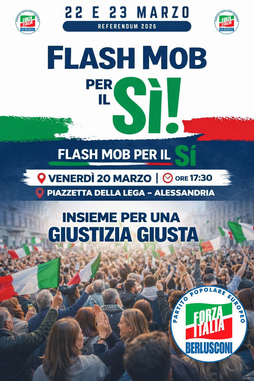 ALESSANDRIA – Questo venerdì 20 marzo è in programma un flash mob per il Sì al referendum sulla giustizia in Piazzetta della Lega, ad Alessandria. L’iniziativa, promossa da Forza Italia, è fissata alle 17.30 e rientra nelle attività di avvicinamento al voto del 22 e 23 marzo.