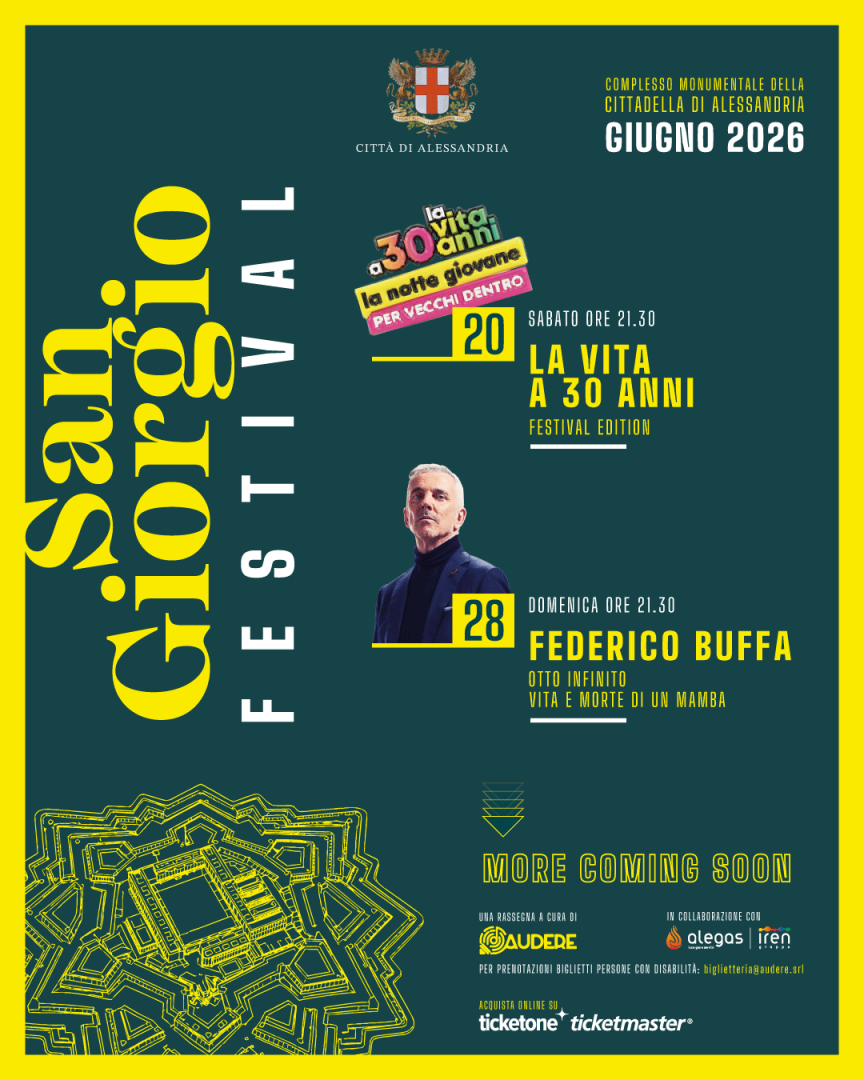 ALESSANDRIA – Torna anche quest’anno ad Alessandria il San Giorgio Festival, uno degli appuntamenti più attesi dell’estate. L’edizione 2026 segna un nuovo corso organizzativo, con la cura affidata al Gruppo Audere, e si propone di rafforzare ulteriormente l’identità del Festival, ampliando e diversificando l’offerta culturale, con una proposta che spazia tra teatro, musica, narrazione e intrattenimento contemporaneo, con particolare attenzione alla qualità artistica e al coinvolgimento del pubblico. Già ufficiali i primi due appuntamenti, alla Cittadella di Alessandria:
