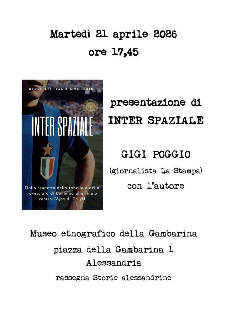 ALESSANDRIA – Martedì 21 aprile 2026, ad Alessandria, alle 17.45, si terrà la presentazione del libro di Beppe Giuliano Monighini, “Inter spaziale”. Lo scrittore alessandrino accompagnerà gli spettatori e i lettori nell’Inter dei primi anni Settanta, quella della leggendaria rovesciata di Bonimba o della finale contro l’Ajax di Cruyff. Un viaggio non solo calcistico ma anche storico in un periodo pieno di fatti e vicende emozionanti tra pallone e Storia. Beppe Giuliano Monighini dialogherà con il giornalista della Stampa, Gigi Poggio. L’incontro si terrà al Museo etnografico della Gambarina ad Alessandria in piazza della Gambarina 1.