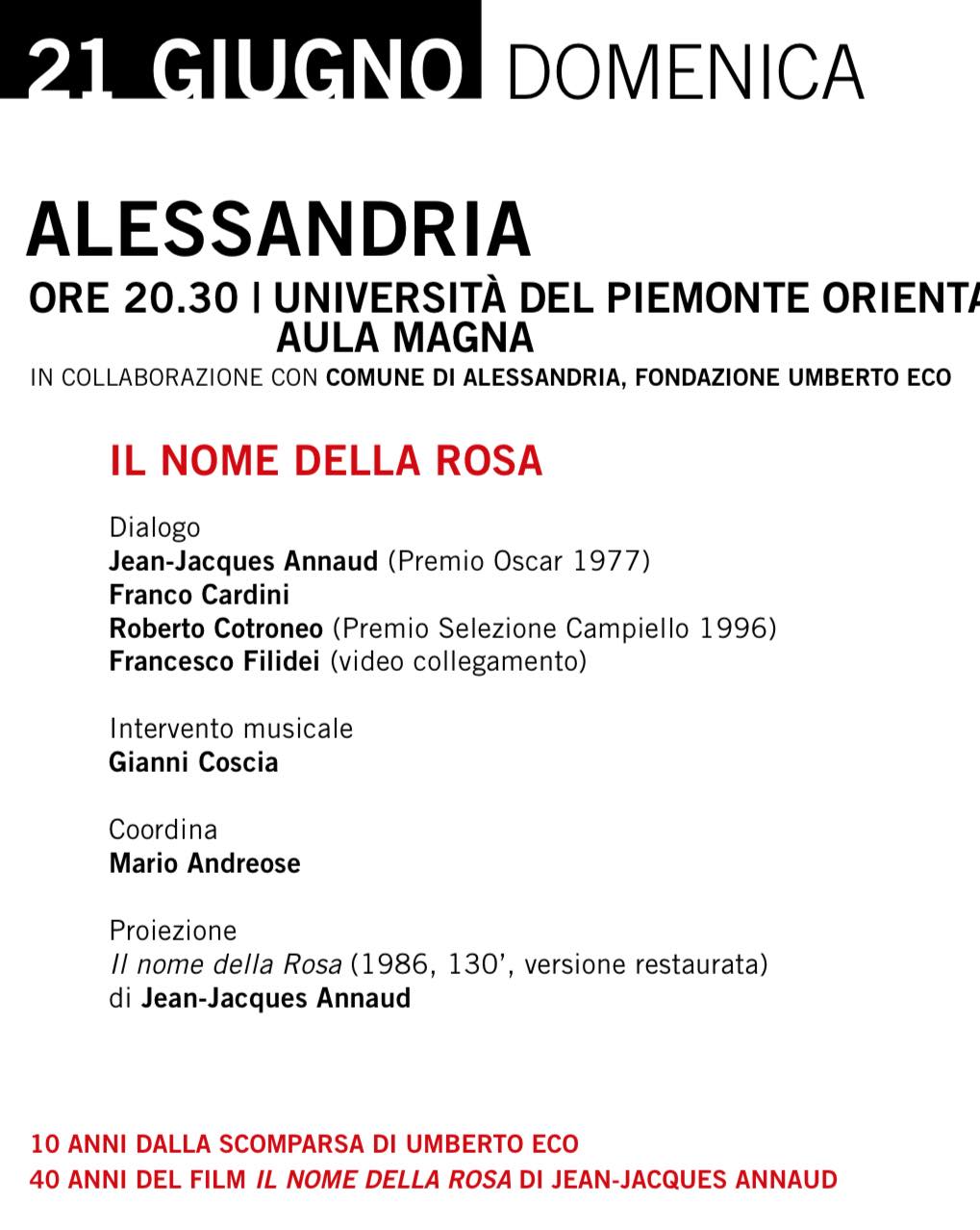 ALESSANDRIA – “Un evento culturale davvero fuori dall’ordinario“. Il sindaco di Alessandria, Giorgio Abonante, ha annunciato così la serata del prossimo 21 giugno, quando in città arriverà Jean-Jacques Annaud, il regista francese del film “Il nome della rosa“, tratto dal più celebre libro di Umberto Eco. L’evento, nell’ambito della Milanesiana di Elisabetta Sgarbi e promosso insieme alla Fondazione Eco e dallo stesso Comune, si terrà nell’aula magna dell’Università del Piemonte Orientale, alle 20.30. Insieme all’artista transalpino saranno presenti anche lo storico Franco Cardini, lo scrittore Roberto Cotroneo e il compositore Francesco Filidei per un dialogo su uno dei capolavori più amati del cinema italiano e internazionale, 40 anni dopo la sua uscita e a dieci anni dalla scomparsa dello stesso Eco.