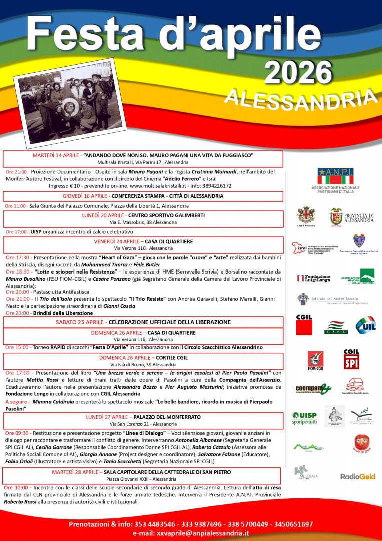 Per il presidente della sezione comunale A.N.P.I. Alessandria Dario Gemma, “la Festa d’Aprile rappresenta, ancora una volta, un’occasione fondamentale per rinnovare i valori della libertà, della democrazia e dell’antifascismo, promuovendo una cultura di pace e coinvolgendo attivamente la cittadinanza”.