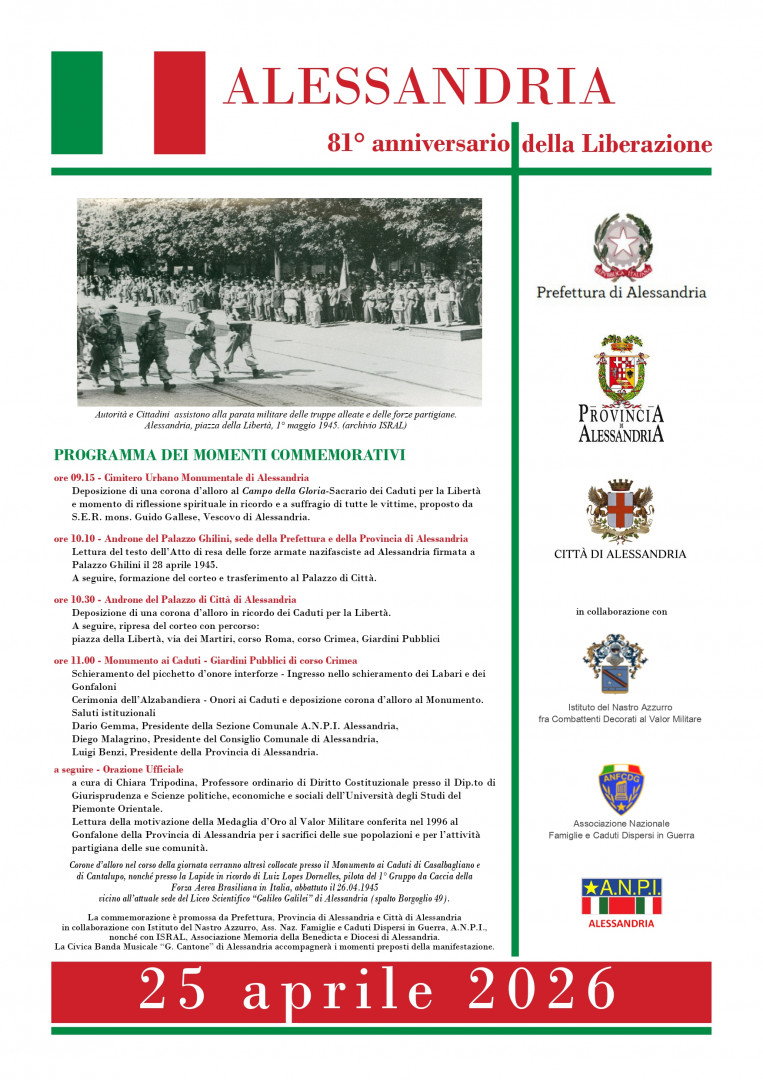 ALESSANDRIA – Ad Alessandria torna anche quest’anno la Festa d’Aprile, l’appuntamento dedicato alla memoria dei valori di libertà, democrazia e partecipazione in occasione dell’81° Anniversario della Liberazione. La celebrazione istituzionale è in programma sabato 25 aprile con i tradizionali appuntamenti dal Cimitero Monumentale Urbano fino all’orazione ufficiale al Monumento ai Caduti di corso Crimea.