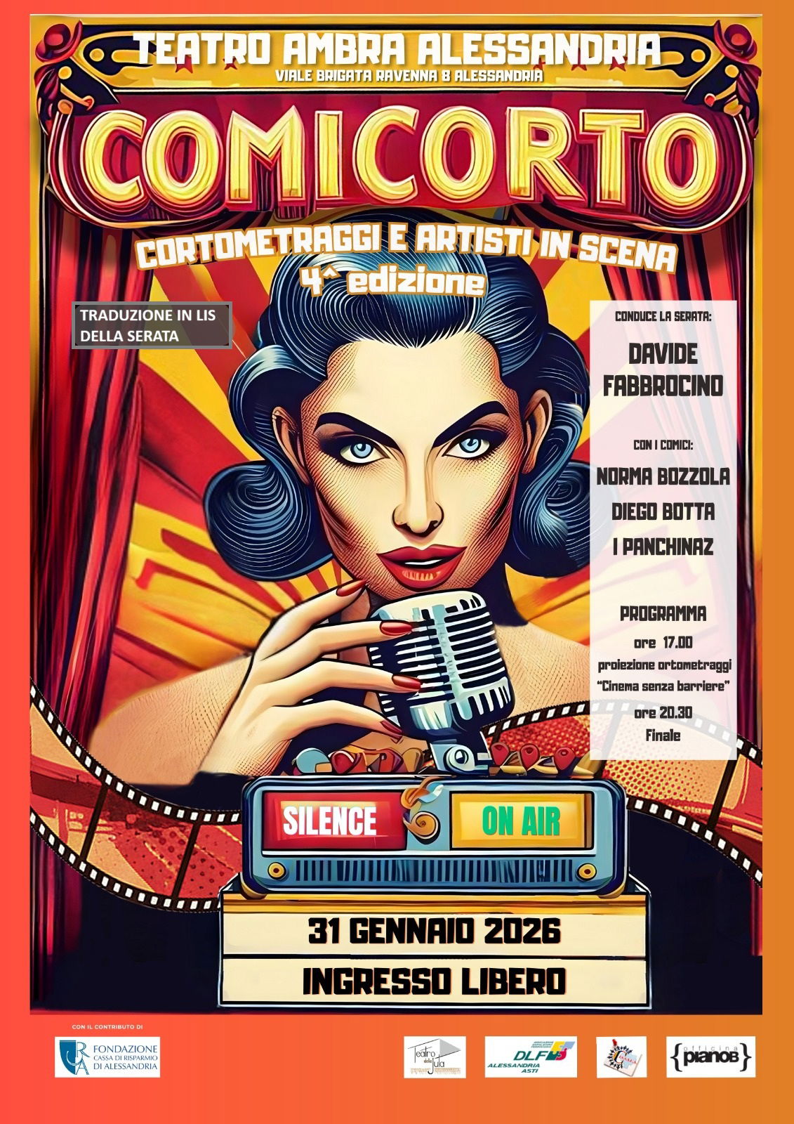 ALESSANDRIA – Sabato 31 gennaio al Teatro Ambra di Alessandria sarà una giornata dedicata ai cortometraggi e ai comici dal vivo: torna la manifestazione Comicorto, organizzata dall’Associazione Commedia Community (Teatro della Juta) insieme al D.L.F. Alessandria e Asti, con il contributo della Fondazione Cassa di Risparmio di Alessandria. Collabora quest’anno anche il Cissaca (Consorzio Servizi Sociali Alessandria) con il suo gruppo denominato “Officina Creativa” composto da operatori e utenti, che ha scelto il vincitore della sezione miglior cortometraggio di argomento sociale.