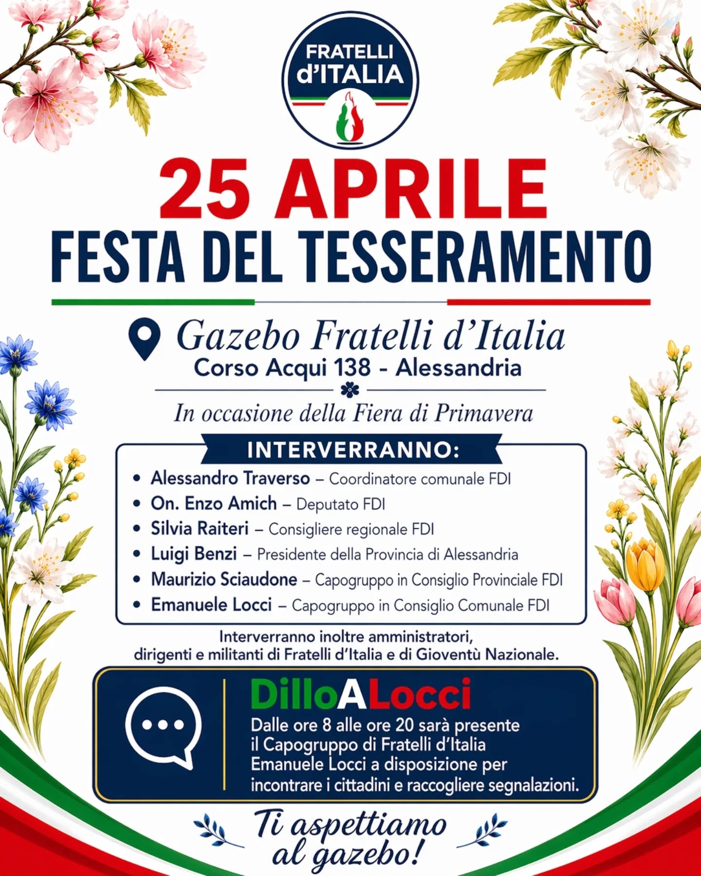ALESSANDRIA – Una locandina definita “provocatoria“. Nella sua rubrica ‘Pietre‘ sul quotidiano “La Repubblica” il giornalista Paolo Berizzi si è soffermato sull’iniziativa di Fratelli d’Italia Alessandria: aver scritto “festa del Tesseramento” (vedi foto in basso) per annunciare il gazebo che questo sabato 25 aprile è stato allestito al quartiere Cristo, in occasione della Fiera di Primavera. “Che tutto avvenga nel giorno della Festa della Liberazione dal nazifascismo ovviamente è un dettaglio. O forse no” ha scritto Paolo Berizzi. Sui social non si è fatta attendere la replica del capogruppo di Fratelli d’Italia ad Alessandria, Emanuele Locci:Pensavo che nella Festa della Liberazione si fosse liberi anche di organizzare un gazebo, incontrare i cittadini, ascoltare problemi e raccogliere proposte. Persino se non si è comunisti. O forse no?”