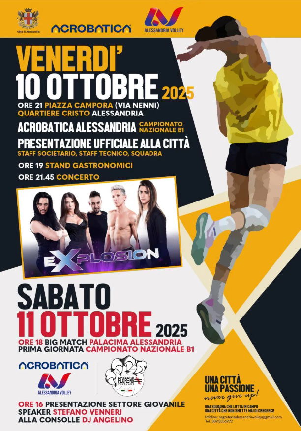 ALESSANDRIA – Tutto pronto per due giorni imperdibili per gli appassionati di pallavolo. Tra questo venerdì e sabato Acrobatica Volley rompe gli indugi per una nuova stagione di serie B1 che si preannuncia carica di significato. Già questo venerdì sera, alle 21, nell’ambito della Festa del Cristo si terrà la presentazione ufficiale della prima squadra in piazza Campora, seguita dal concerto degli Explosion, alle 21.45.
