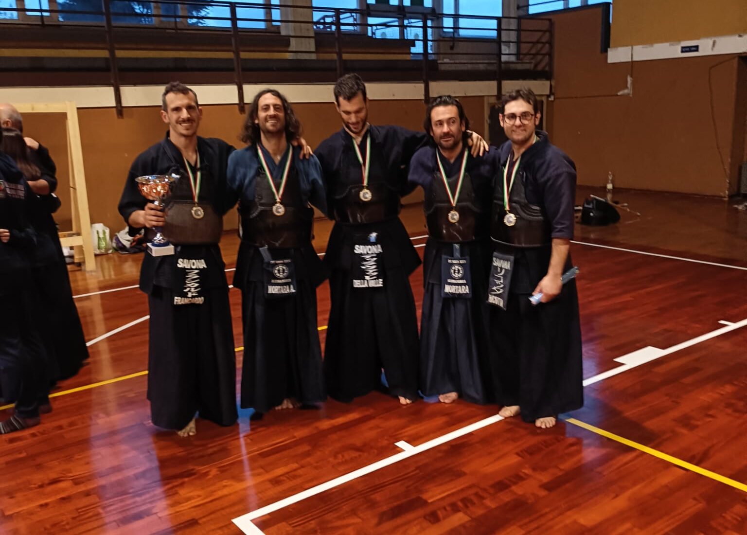 A salire sul gradino più alto del podio il Circolo Scherma Savona Kendo, che ha presentato una squadra mista composta dai savonesi Matteo Francardo, Stefano Della Valle e Ricotta, insieme ai fratelli alessandrini del Doshinken, Alessandro e Francesco Mortara. Proprio i due fratelli si sono rivelati determinanti per la conquista dell’oro, vincendo tutti gli incontri e ricevendo i complimenti personali del maestro giapponese. Grande soddisfazione in casa Doshinken, espressa dal maestro Pasquale Scarcella e dal presidente Marco Mirabelli. Un inizio d’anno che, dopo questa vittoria, incoraggia tutti gli atleti a puntare a nuovi e ambiziosi traguardi.