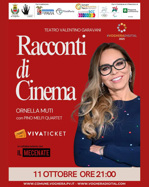 VOGHERA – Questo sabato, 11 ottobre 2025, la quinta edizione di Voghera Digital (www.vogheradigital.com), alle 21, al Teatro Valentino Garavani, la famosa attrice Ornella Muti, accompagnata dal Pino Melfi Quartet, proporrà “Racconti di Cinema”.