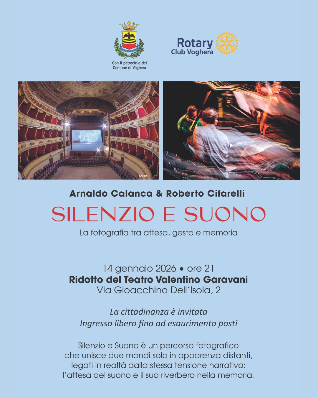 VOGHERA – Oggi, mercoledì 14 gennaio 2026, al Ridotto del Teatro Valentino Garavani, si parlerà di fotografia come linguaggio capace di raccontare il tempo, i luoghi e le persone. L’appuntamento “Silenzio e suono”, promosso dal Rotary Club Voghera, è un “percorso per immagini che mette in dialogo due dimensioni solo in apparenza lontane. Da un lato il silenzio che abita gli spazi, dall’altro il suono che si imprime nella memoria. Le fotografie di Arnaldo Calanca ci accompagnano in luoghi sospesi, architetture che conservano tracce di vite passate e che raccontano il tempo attraverso l’attesa. Spazi che sembrano immobili ma che parlano, suggerendo storie e trasformazioni. Accanto a questi, il Teatro restaurato diventa simbolo di un silenzio fecondo, quello che precede il ritorno della voce, della musica, della vita”.
