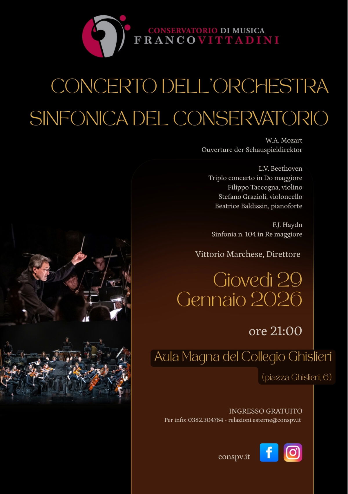 VOGHERA – Il Conservatorio di Musica Franco Vittadini di Pavia presenta il Concerto dell’Orchestra Sinfonica del Conservatorio, in programma giovedì 29 gennaio 2026 alle ore 21.00 presso l’Aula Magna del Collegio Ghislieri (Piazza Ghislieri 6, Pavia). L’appuntamento rappresenta uno dei momenti più significativi dell’attività artistica e formativa dell’Istituto e vede protagonista l’Orchestra Sinfonica del Conservatorio, impegnata in un programma di grande rilievo del repertorio classico e sinfonico. Il concerto si aprirà con l’Ouverture da Der Schauspieldirektor di W. A. Mozart, seguita dal Triplo Concerto in Do maggiore di L. v. Beethoven. A concludere la serata sarà la Sinfonia n. 104 in Re maggiore “London” di Franz Joseph Haydn. Nel Triplo Concerto di Beethoven si esibiranno Filippo Taccogna (Violino), Stefano Grazioli (violoncello) e Beatrice Baldissin (pianoforte), tre giovani di straordinario livello musicale, recenti vincitori della selezione interna del Conservatorio “Vittadini”, che si sono distinti per le eccellenti qualità artistiche e interpretative. La loro partecipazione rappresenta una significativa opportunità di valorizzazione del talento emergente e conferma l’impegno del Conservatorio nel promuovere esperienze performative di rilievo professionale all’interno del proprio percorso formativo, nonché attesta il Conservatorio di Pavia tra gli istituti nazionali in grado di formare giovani concertisti pronti per affrontare la carriera solistica.