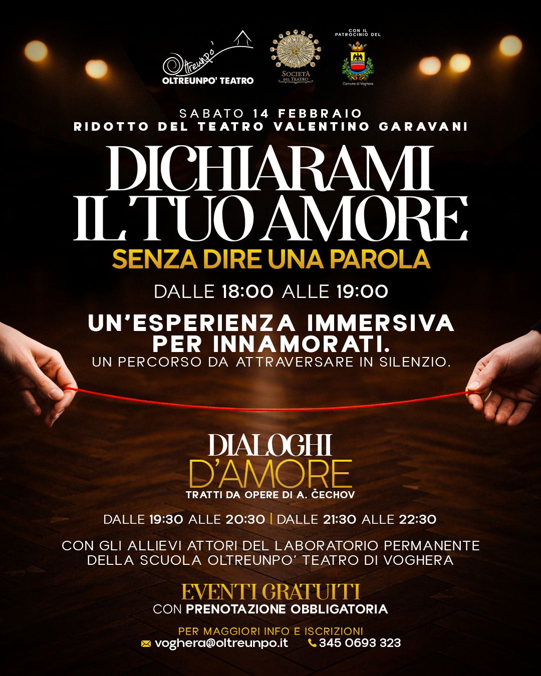 Gli eventi sono gratuiti ma con prenotazione obbligatoria, fino a esaurimento posti. Per partecipare è necessario inviare una mail a voghera@oltreunpo.it, indicare nome e cognome dei partecipanti, specificare l’orario scelto (18.00/18.30 per il percorso immersivo – 19.30 oppure 21.30 per i Dialoghi d’amore), lasciare un recapito telefonico. La conferma arriverà direttamente dall’organizzazione.