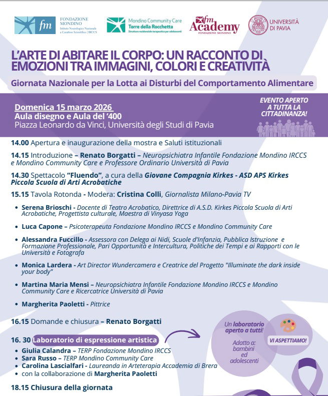 Il programma si aprirà alle 14 con l’inaugurazione di una mostra artistica realizzata con la collaborazione dell’artista visiva Margherita Paoletti insieme a ragazze e ragazzi delle scuole e delle strutture terapeutiche per i disturbi alimentari della Fondazione Mondino. Seguiranno i saluti istituzionali e un’introduzione scientifica del professor Renato Borgatti, direttore dell’Unità operativa di Neuropsichiatria infantile e professore ordinario dell’Università di Pavia.