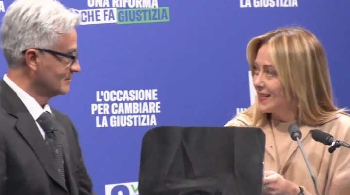 MILANO – È riuscito a salire sul palco mentre Giorgia Meloni stava per iniziare il suo intervento, le ha stretto la mano, consegnato un libro e poi ha pronunciato una frase che ha spiazzato tutti: “Aspetto le dimissioni di Mattarella“. È la scena inattesa che ha aperto l’evento organizzato da Fratelli d’Italia al Teatro Franco Parenti di Milano, dedicato al referendum sulla giustizia del 22 e 23 marzo.