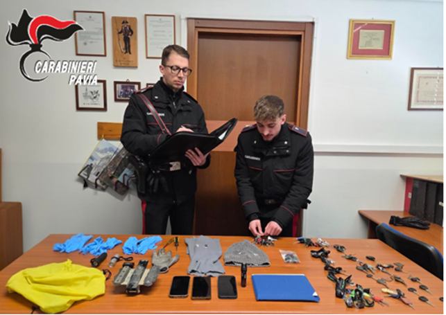 Grazie agli approfondimenti i militari, sotto il sedile passeggero, hanno scoperto un sacchetto con numerosi mazzi di chiavi di vari veicoli. La perquisizione è stata estesa anche ai tre fermati, e ha portato alla scoperta di due passamontagna, torce, spray al peperoncino, cacciaviti, guanti in lattice, un ulteriore portachiavi con 7 chiavi e un localizzatore GPS, presumibilmente estratto dal veicolo che, tuttavia, era dotato di più dispositivi di posizionamento. I Carabinieri inoltre, successivamente, hanno accertato che una delle sette chiavi, era anche stata limata consentendo l’accensione del veicolo asportato.