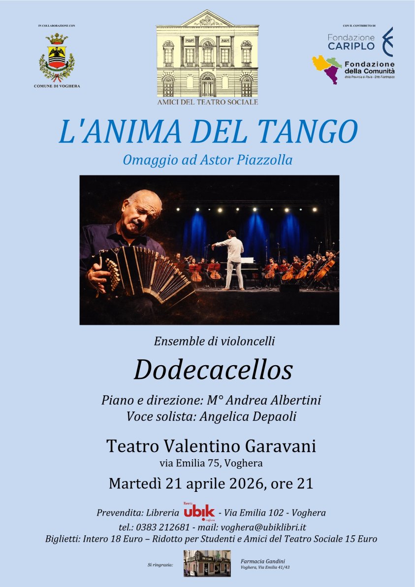 VOGHERA – A Voghera torna protagonista la grande musica con una serata dal forte impatto emotivo e sonoro. Martedì 21 aprile, alle 21, il Teatro Valentino Garavani ospiterà “L’Anima del Tango – Omaggio ad Astor Piazzolla”, appuntamento promosso dagli Amici del Teatro Sociale in collaborazione con il Comune di Voghera e con il contributo di Fondazione Cariplo, Fondazione della Comunità della Provincia di Pavia e Farmacia Gandini.