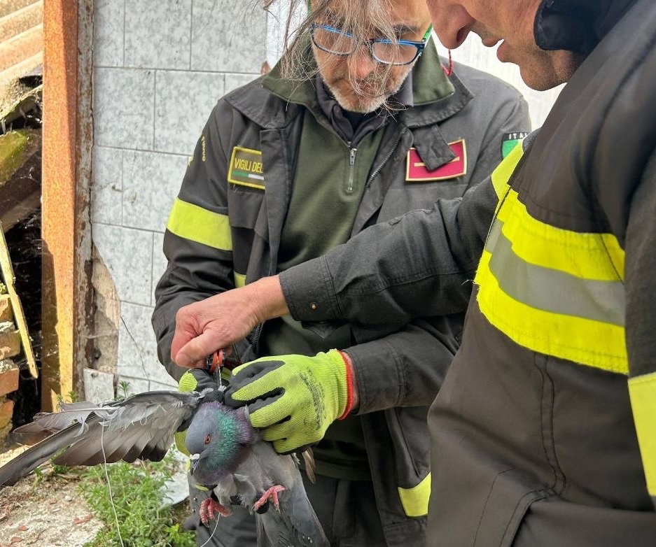 Piccione intrappolato nel filo da pesca. Soccorso dai Vigili del Fuoco a Vidigulfo
