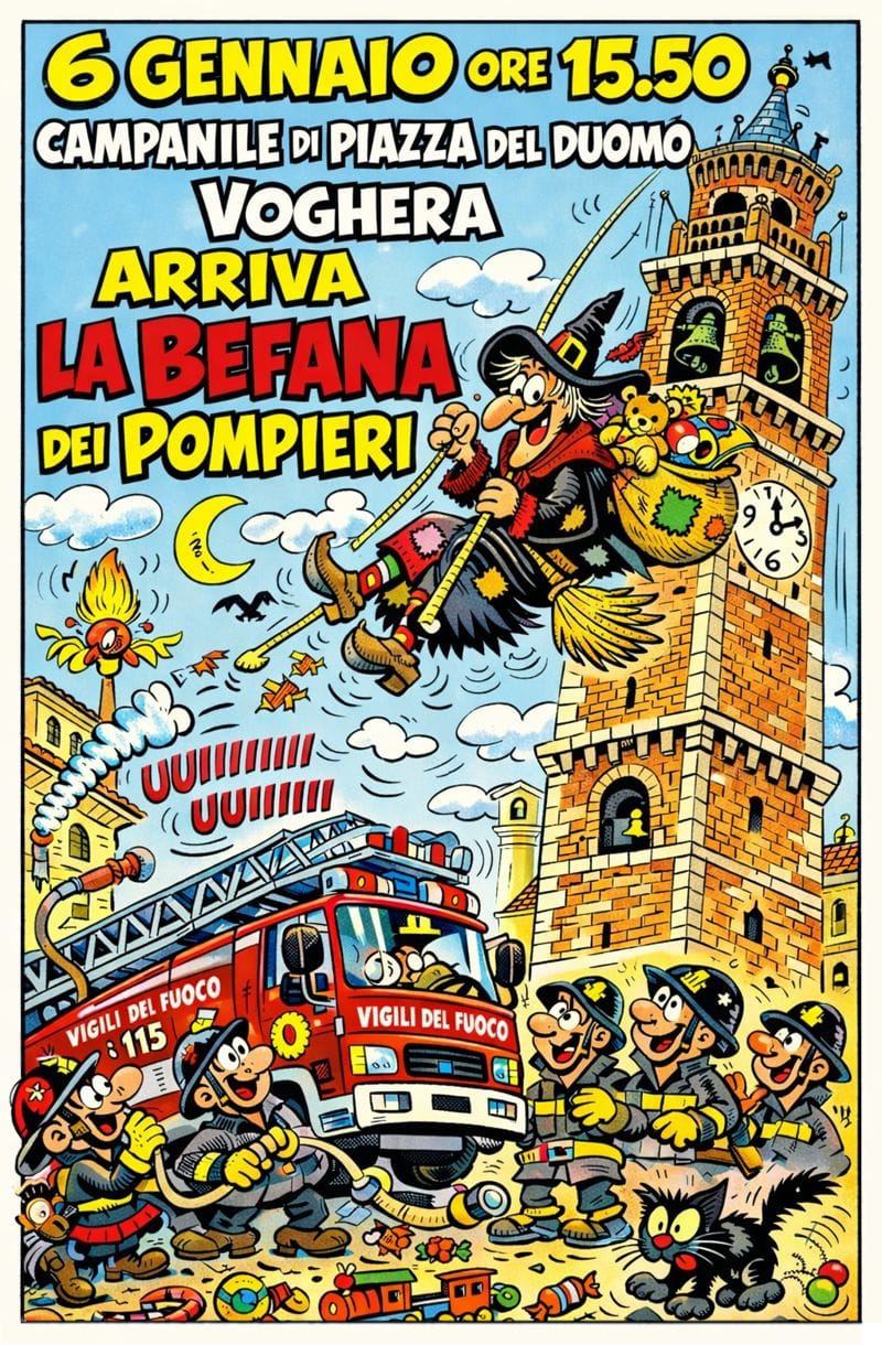 VOGHERA – Anche quest’anno Voghera ritroverà la simpatica Befana dei Vigili del Fuoco. Oggi, martedì 6 gennaio 2026, alle 15.50, dal campanile di piazza Duomo, la terribile vecchietta regalerà dolciumi e allegria.