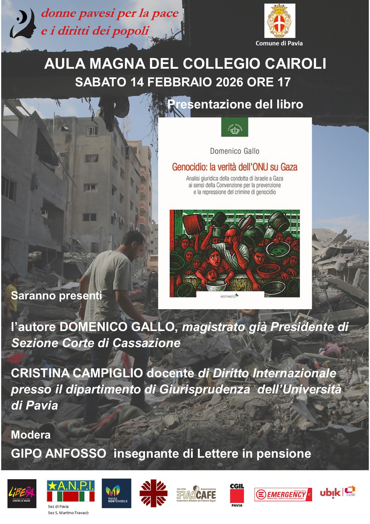 PAVIA – Questo sabato 14 febbraio alle 17 nell’Aula Magna del Collegio Cairoli di Pavia si terrà la presentazione del libro “Genocidio: la verità dell’ONU su Gaza” di Domenico Gallo. L’incontro è promosso da “Donne pavesi per la pace e i diritti dei popoli” con il patrocinio del Comune di Pavia. Il volume propone un’analisi giuridica della condotta di Israele a Gaza alla luce della Convenzione per la prevenzione e la repressione del crimine di genocidio.
