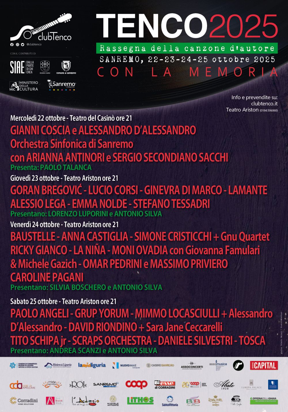 La rassegna comprende nel suo programma, oltre alle tre serate, tanti eventi, proiezioni, presentazioni, incontri e spettacoli pomeridiani, a partire del 22 ottobre in tutta la città simbolo della musica italiana, dalla sede del Club Tenco nell’ex scalo merci della vecchia stazione ferroviaria al Teatro Casinò, dall’Ex chiesa Santa Brigida nel quartiere Pigna al Cinema Ritz. Tra gli ospiti tanti gli artisti che si succederanno sul palco dell’Ariston e che parteciperanno agli eventi nelle altre venue: Paolo Angeli, Arianna Antinori, Guido Baldoni, Pierdavide Carone, Gianni Coscia, Simone Cristicchi Con Gnu Quartet, Alessandro D’alessandro, Lamante, Alessio Lega, Emma Nolde, Moni Ovadia, Giovanna Famulari, Michele Gazich, Omar Pedrini Con Massimo Priviero, Ricky Portera, David Riondino Con Sara Jane Ceccarelli, Scraps Orchestra, Michele Staino e Stefano Tessadri. Le prevendite relative agli abbonamenti e ai biglietti delle singole serate sono online su clubtenco.it e aristonsanremo.com oppure presso il botteghino del Teatro Ariston (tutti i giorni dalle ore 17.00 alle ore 21.00, info. 0184 50.60.60).