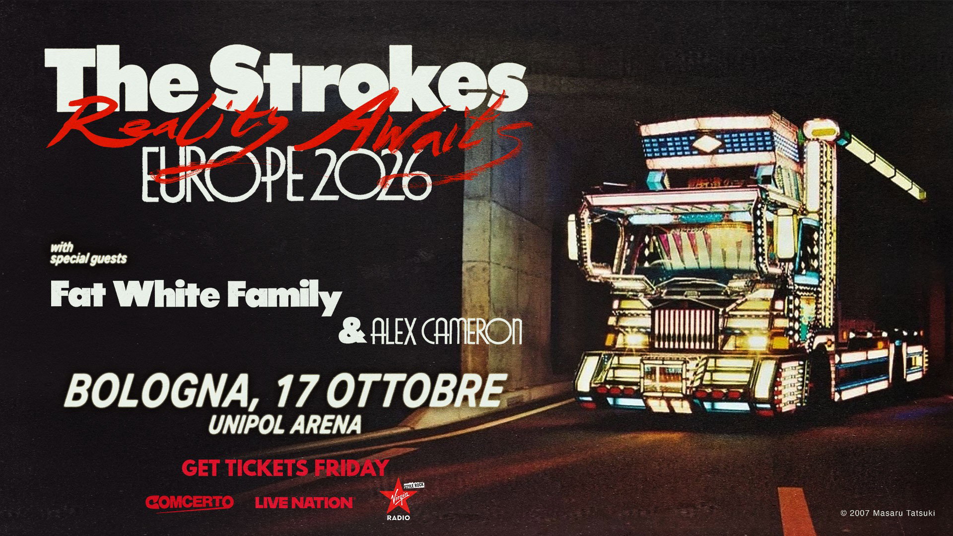 Reduci dal trionfo al Coachella, The Strokes annunciano il “Reality Awaits Europe 2026” e confermano un unico appuntamento live in Italia. L’evento segnerà il ritorno della band a sei anni dall’ultimo album, in concomitanza con la pubblicazione del nuovo disco Reality Awaits (Sony Music/RCA, 26 giugno), già lanciato dal singolo “Going Shopping“. Il loro nuovo tour mondiale toccherà Nord America, Regno Unito, Europa e Giappone. La tournée partirà a giugno e proseguirà per tutto l’autunno, includendo un attesissimo e unico appuntamento dal vivo in Italia, sabato 17 ottobre 2026 a Bologna, alla Unipol Arena (Via Gino Cervi, 2, 40033 Casalecchio di Reno BO). Il tour vedrà la band di New York protagonista sui palchi più prestigiosi del mondo, con tappe doppie al Red Rocks, e show alla O2 Arena di Londra, all’RBC Amphitheatre di Toronto, all’Accor Arena di Parigi e allo Ziggo Dome di Amsterdam. Ad accompagnare la band nella data italiana Fat White Family e Alex Cameron.
